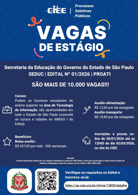 Inscrição e prova online: de 28/01 a 02/03/2026, no site do CIEE